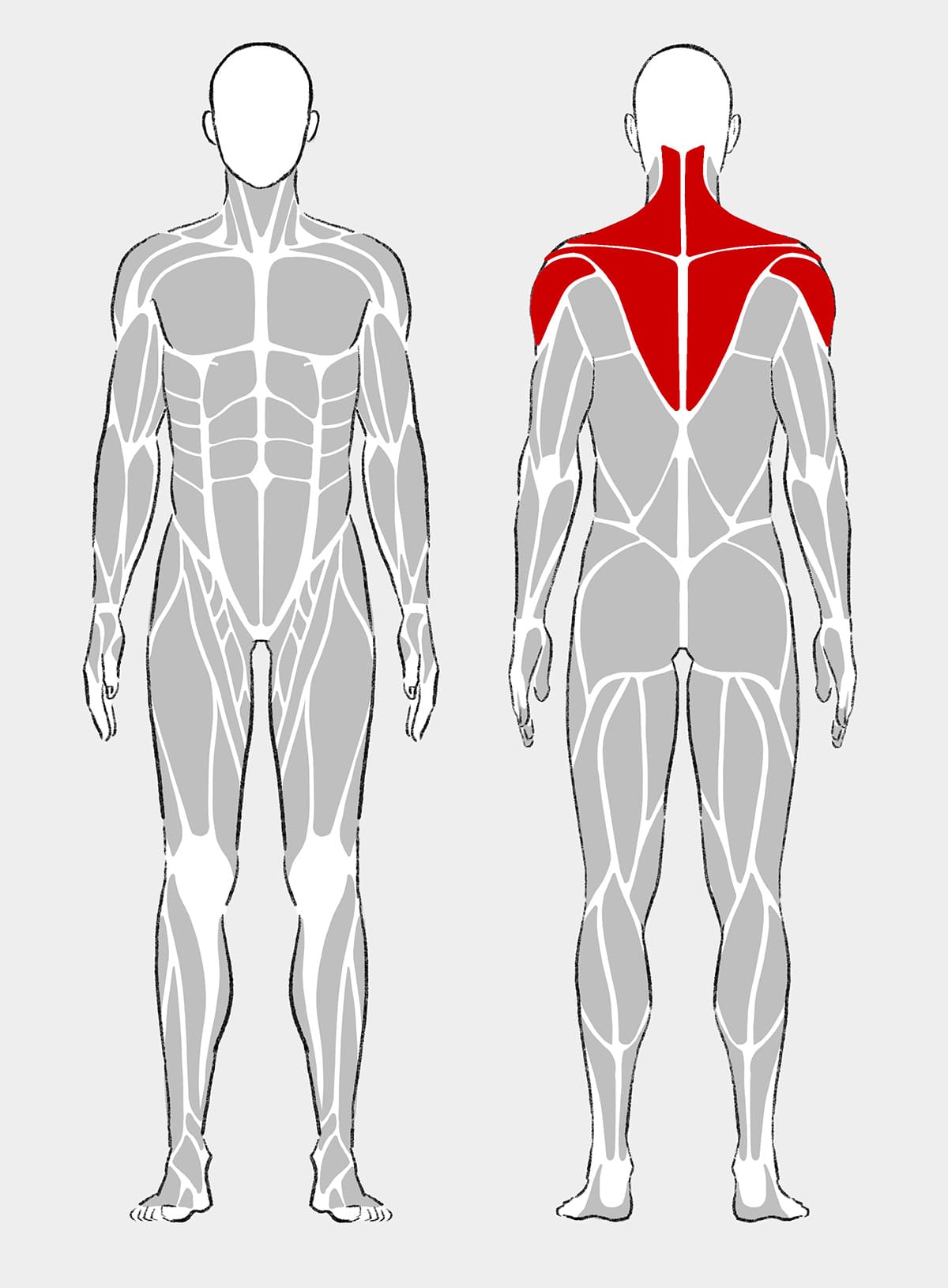 僧帽筋は首の後ろから背中の上部にかけて広がる筋肉で、肩甲骨を動かす働きを担う。腕を引く動作や肩甲骨を寄せる動きに関わる。