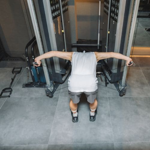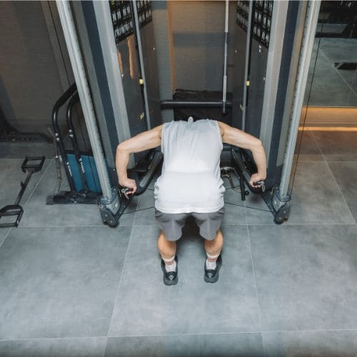 三角筋後部は重い重量を扱うよりもフォームを安定させることが大切です。重量を優先すると反動が入りやすく、僧帽筋や背中の筋肉へ負荷が逃げやすくなります。そのため、無理に重量を上げるよりも、正しいフォームを維持できる範囲で設定することを優先しましょう。