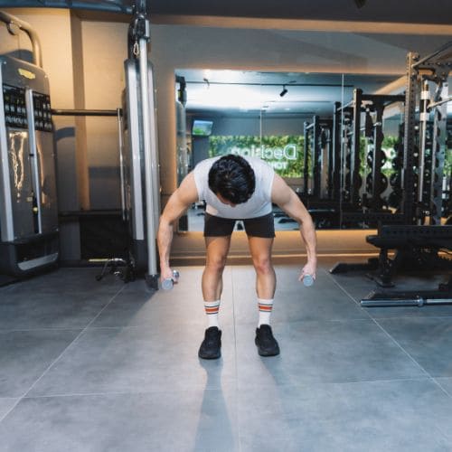 STEP1:両手にダンベルを持ち、前傾姿勢になる