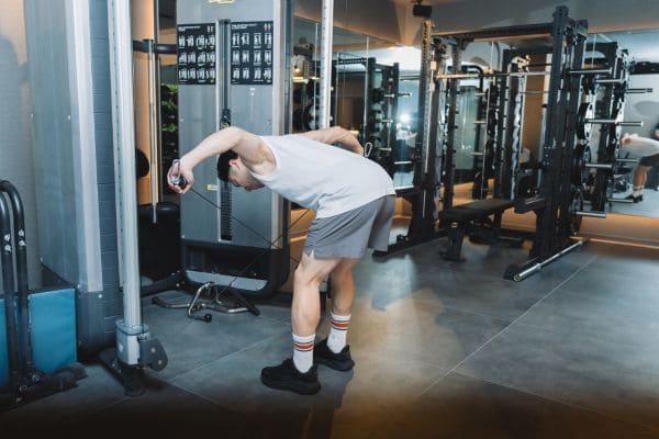 スタンディングでのリアレイズは、前傾姿勢を保ちながら腕を動かすため、上体を安定させる体幹のコントロールも求められます。