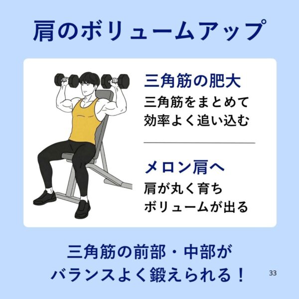 筋肥大による肩の丸みとボリューム、肩幅の印象づくりに直結し、押す動作の筋力強化にもつながる。