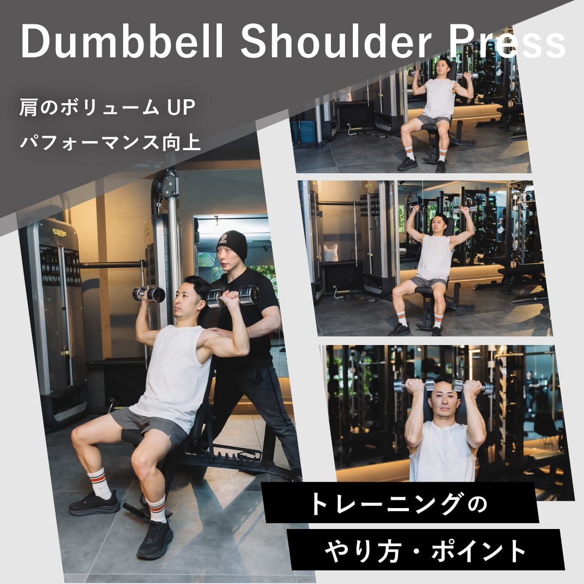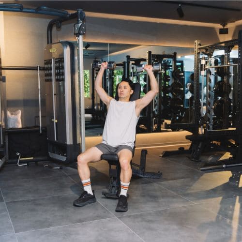 ダンベルは左右の手が独立し、軌道を微調整しながら押し上げられるため、肩の動きに合わせたトレーニングが組みやすい。安定性の確保は必要になるものの、左右差を意識しやすく、狙った軌道で肩へ負荷を集めやすい点がメリット。