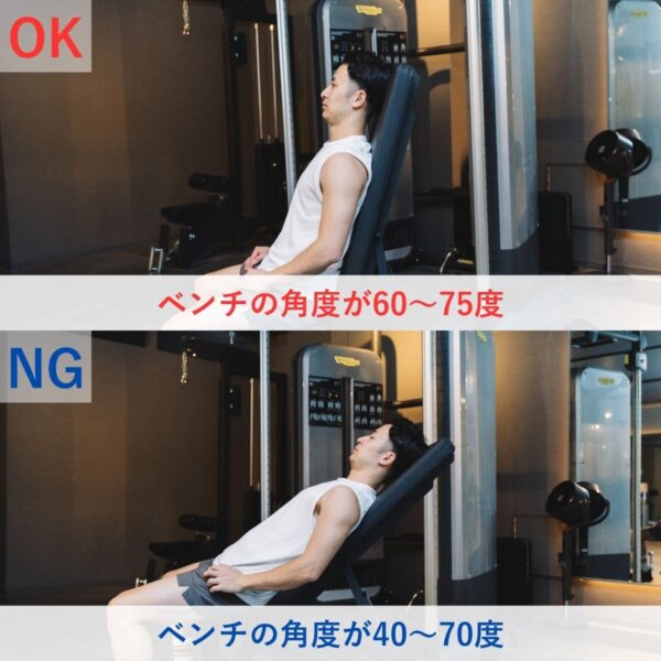 STEP1:ベンチの角度を60~75度にし、上体をまっすぐ保つ