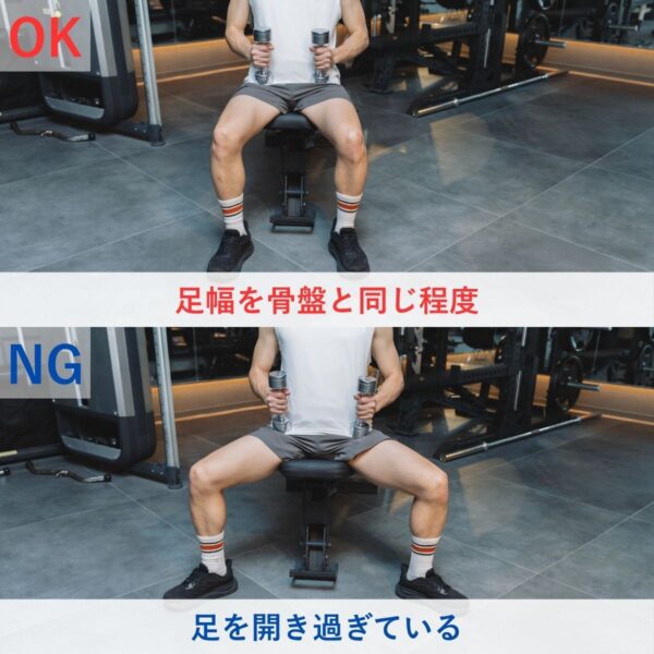 足を広げすぎると体幹が安定しにくく、押し上げ動作の力が分散しやすくなります。また、前腕が床に対して垂直になるようにダンベルを持つと、押し上げる力を安定させやすくなります。