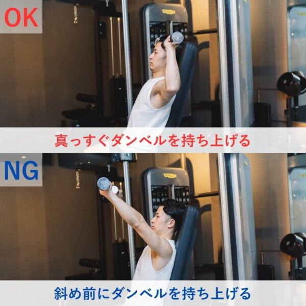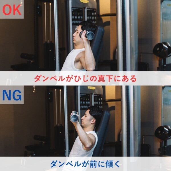 ダンベルがひじの真上に位置する状態を保つことが大切。ひじの真上にダンベルを乗せるイメージを持つことで、肩の真上へまっすぐ押し上げる軌道を作りやすくなる。