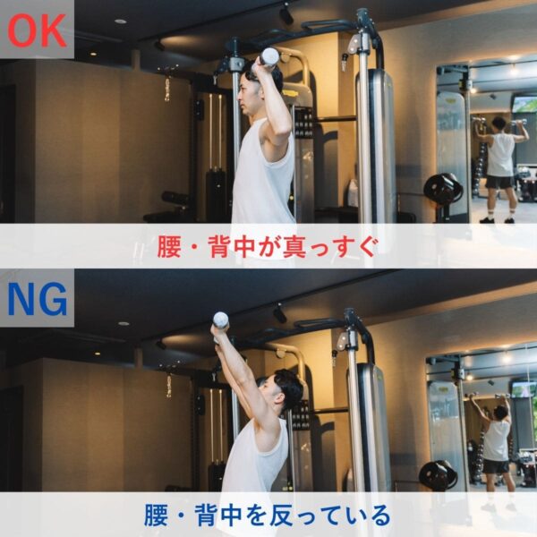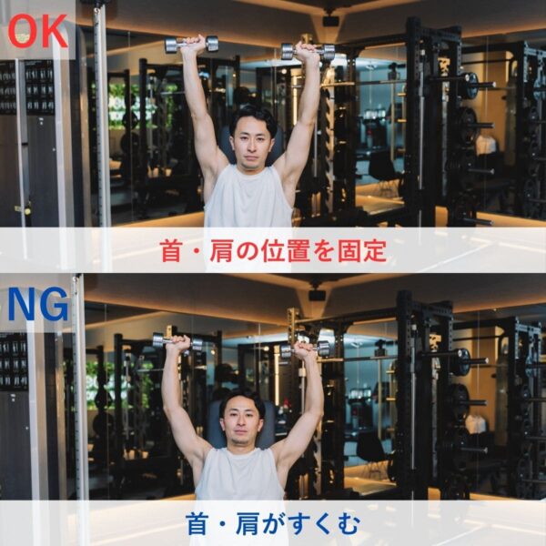 修正ポイントとして、「首を長く保つ」「肩を下げたまま押す」意識を入れ、ダンベルを頭上でぶつけないこと。