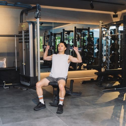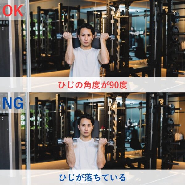 スタートポジションでひじの角度を90度にすると、ダンベルを押し上げる動作が安定しやすく感じました。また、ひじを肩の高さ付近まで上げて構えることで、動作の軌道も整いやすくなりました。