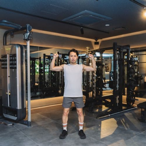 - 足を肩幅程度に開き、ダンベルを肩の高さで構える