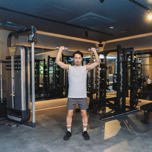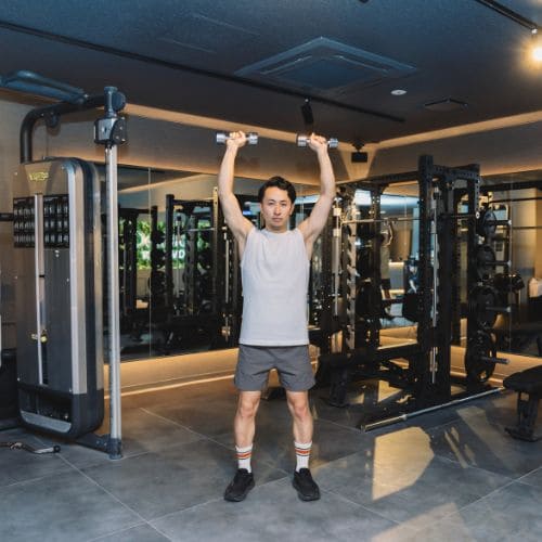 立っておこなうダンベルショルダープレスは、体幹の安定が前提になる種目です。ベンチに頼れない分、腰が反ったり重心が前後にぶれたりしやすく、フォームが崩れると肩への刺激も分散しやすくなるので注意しましょう。
