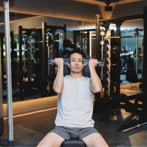ダンベルショルダープレスは、肩の丸みやボリュームをつくりたいときに取り入れやすい代表的な肩トレのひとつ。ダンベルがあれば自宅でもジムでも実践しやすく、三角筋を中心にしっかり刺激を入れられるのが特徴。
