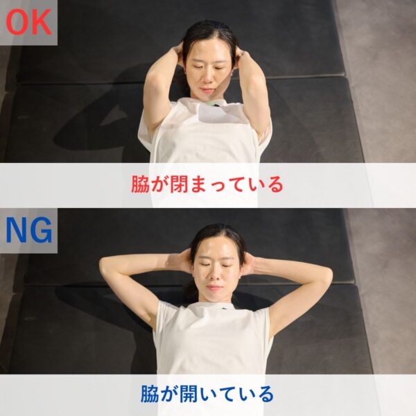 脇が開くと腹筋の収縮があまくなり、お腹の力が抜けやすくなります。手は軽く添える程度にして、脇を締めたままお腹を使う意識を持つことがポイントです。