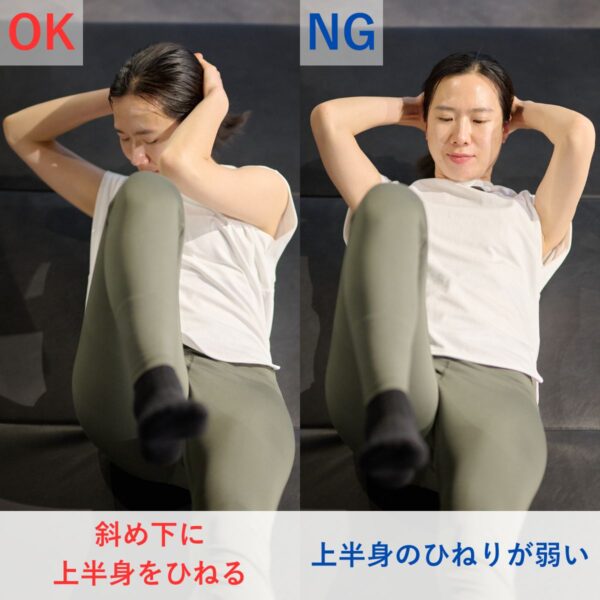 斜め下へしっかりひねることで、腹斜筋への刺激を感じやすかったです。反対にひねりが弱いと動作が浅くなり、腹筋への効きがぼやける感覚がありました。