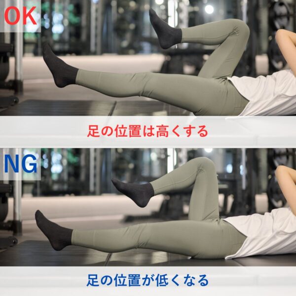足は漕ぐ意識よりも、骨盤が前に傾かないように支える・真っすぐ蹴るイメージを持つことが大切です。また、一往復で一度しっかり息を吐くリズムを意識すると、腹筋の収縮を引き出しやすくなります。
