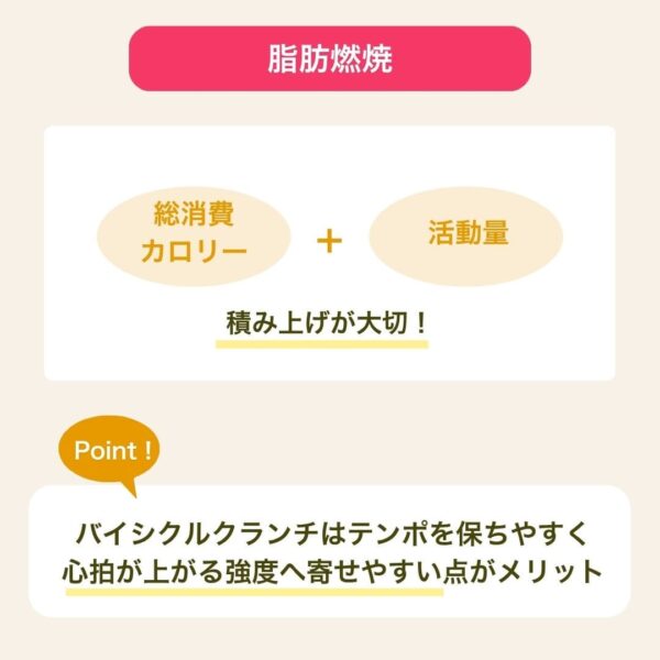 脂肪燃焼は局所の腹筋運動だけで完結しにくく、総消費カロリーと活動量の積み上げが大切。バイシクルクランチはテンポを保ちやすく、心拍が上がる強度へ寄せやすい点がメリット。