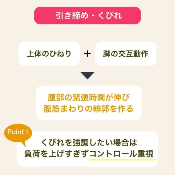 | ボディメイク | お腹まわりが引き締まり、シックスパックの土台をつくりやすい |