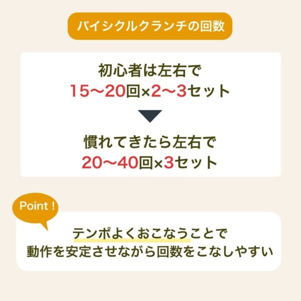バイシクルクランチはテンポよくおこなうことで、動作を安定させながら回数をこなしやすくなります。目安として、まず20回程度をリズミカルに続けられることを目標にしましょう。