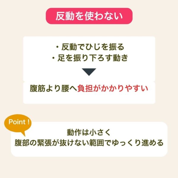 反動でひじを振る、足を振り下ろす動きは腹筋より腰へ負担が乗りやすくなる。とくに足を勢いよく動かすと骨盤が前傾し、腰が反りやすくなる。