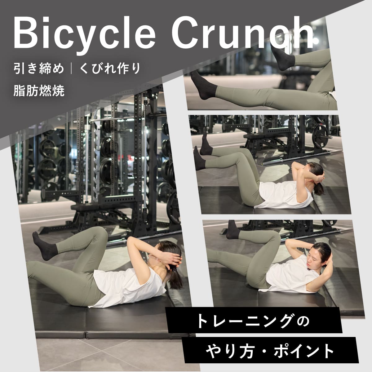 バイシクルクランチは腹部をひねりながら動かす種目で、ウエストの引き締めや体幹の安定に結びつきやすい。