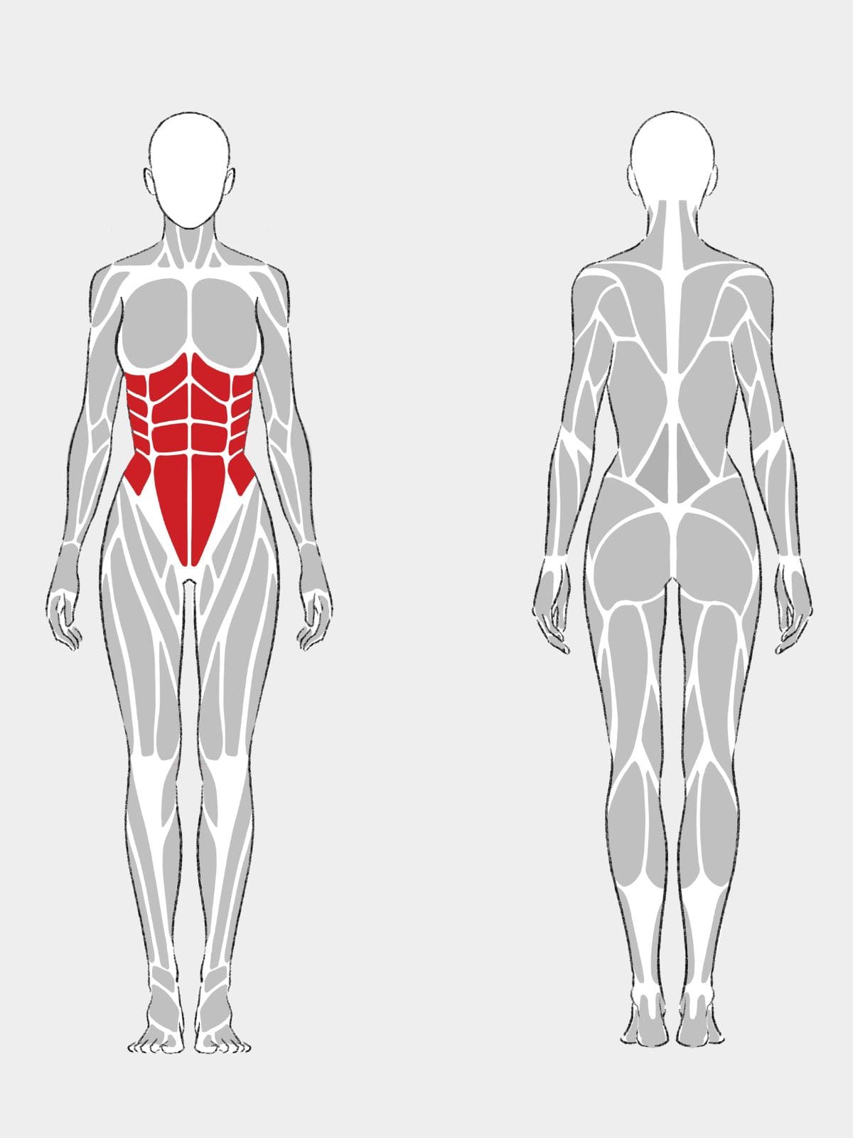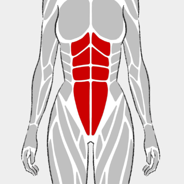 腹直筋は体幹を丸める屈曲で働き、いわゆるシックスパックの中心になる腹筋。バイシクルクランチでは上体を起こす局面で短縮し、脚を浮かせた状態を保つことで腹部の緊張を維持しやすい。