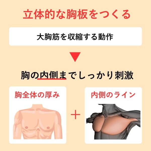 そのため、胸全体の厚みだけでなく、内側のラインも強調され、立体感のある胸板をつくりやすい。