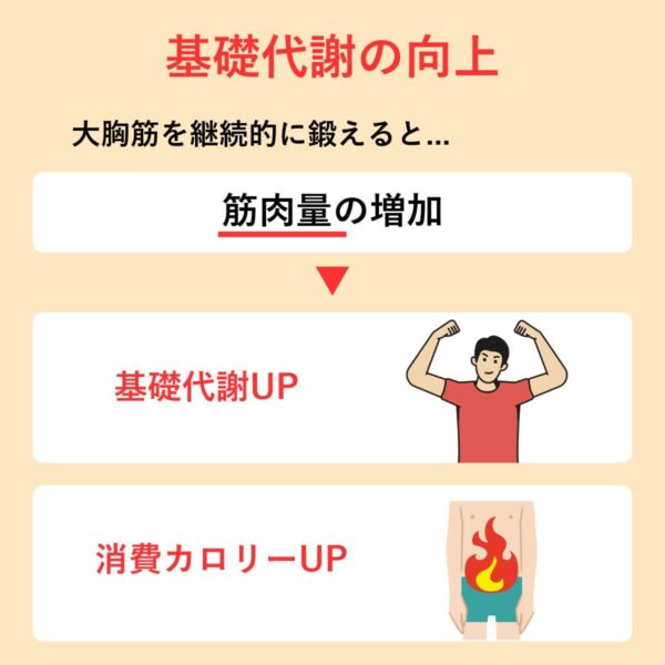 大胸筋を継続的に鍛えることで筋肉量の増加につながり、基礎代謝の向上が期待できる。筋肉量が増えることで、日常生活における消費エネルギーも高まりやすくなる。