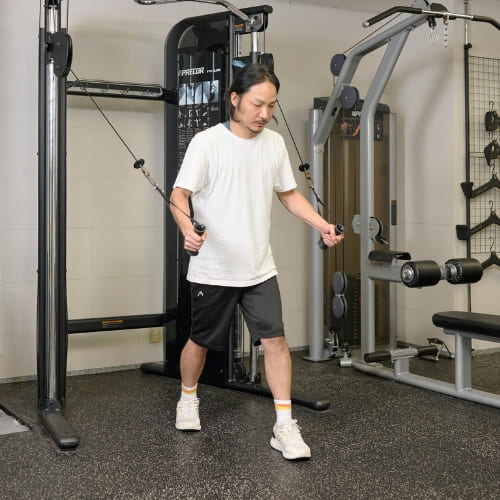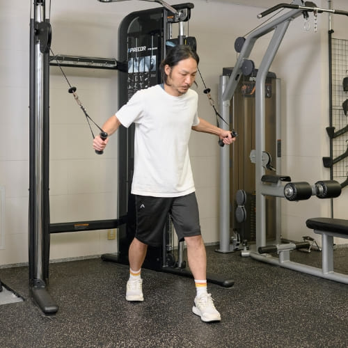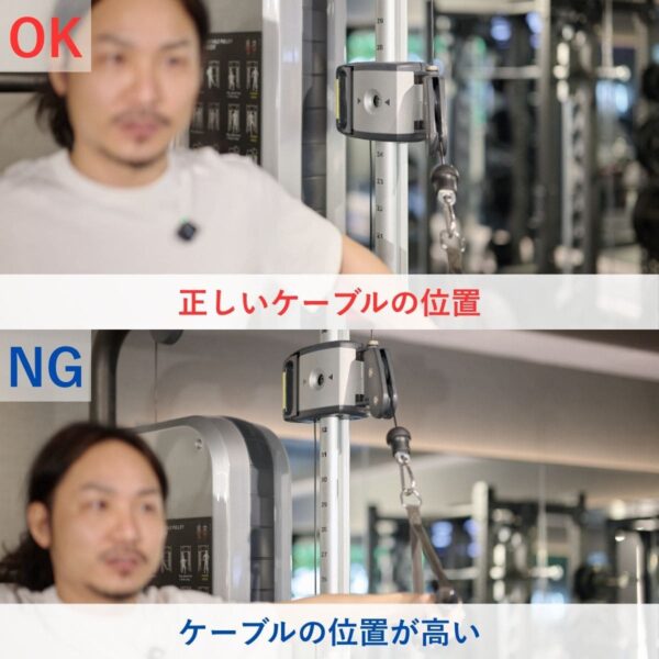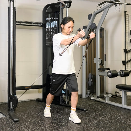 ケーブルの高さが重要で、胸の位置に合わせることで大胸筋中部に適切な負荷がかかります。位置が高すぎると肩の関与が強くなりやすいため注意しましょう。動作中は腕ではなく、胸を閉じる意識を持つことで効果も高まります。