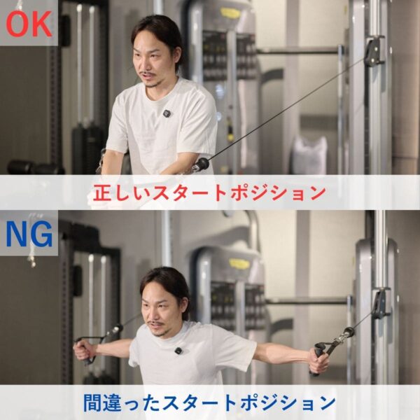 スタートポジションで軽く胸を寄せておくことで、その後の動作でも大胸筋を使いやすくなります。最初のポジションづくりで効き方が大きく変わるため、ていねいにセットしましょう。