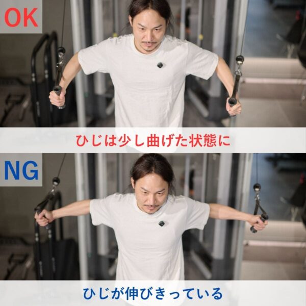 ひじを伸ばしきると関節や腕に負荷が逃げやすくなります。軽く曲げた状態を保つことで、大胸筋に負荷を乗せ続けることができます。