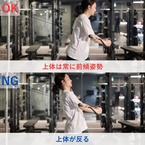 上体を軽く前傾させることで、大胸筋に負荷が乗りやすくなります。上体が反ると肩への負担が大きくなるため、姿勢を保ったまま動作することが重要です。