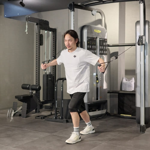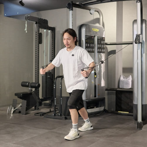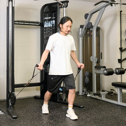 ケーブルの高さは大胸筋中部〜下部に刺激を入れる基本の設定です。位置が高すぎると肩の関与が強くなりやすいため、まずは肩の高さで正しいフォームを身につけるのがおすすめです。