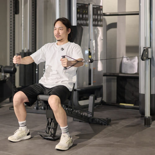 立った状態よりも身体が安定する分、胸に効いている感覚が分かりやすかったです。ケーブルの位置が高いと肩に入りやすくなり、胸への刺激が弱くなると感じました。