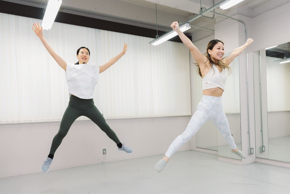 ジャンプと腕の動きを同時におこなうことで、自然とテンポよく続けやすくなります。動きが単調にならないので、サーキットトレーニングの最後でも気持ちよく体を動かせました。