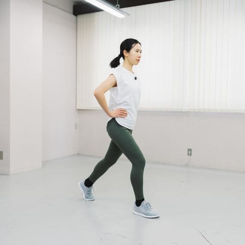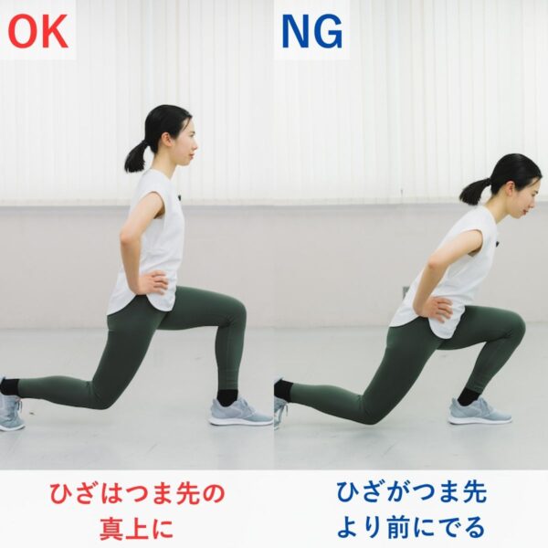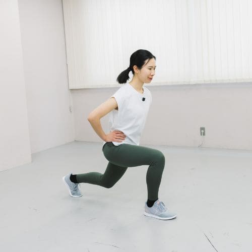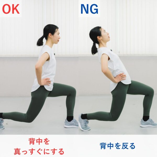 バックランジでは、頭からお尻までを一直線に保つ姿勢を意識すると、太ももの裏やお尻に力が入りやすくなります。
