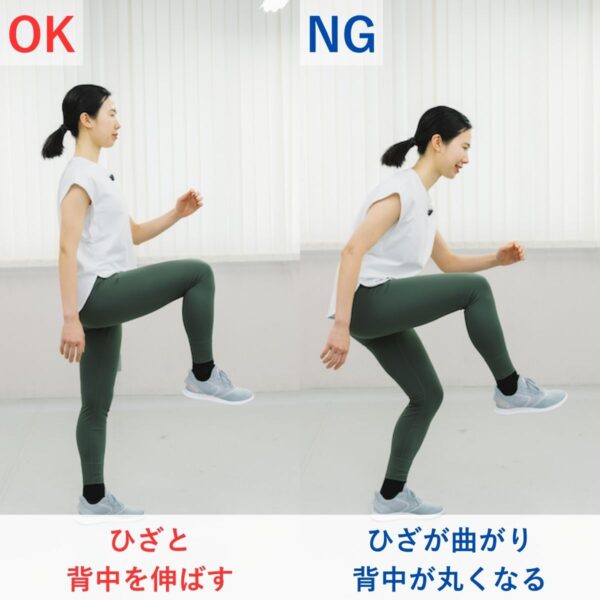 ニーアップでは動作中に体幹が崩れると背中が丸くなりやすくなるため、姿勢を保ちながら動くことが大切です。