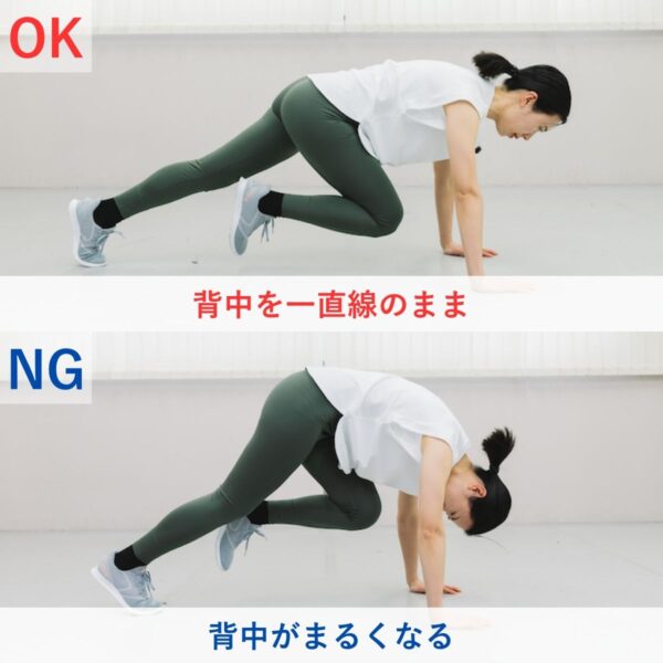 背中が丸くなると体幹が安定しにくくなるため、体のラインを保ちながらリズミカルに脚を入れ替えることがポイントです。