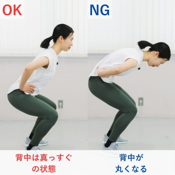 背中が丸くなる・ひざが内側に入ると腰やひざへの負担が増える印象です。