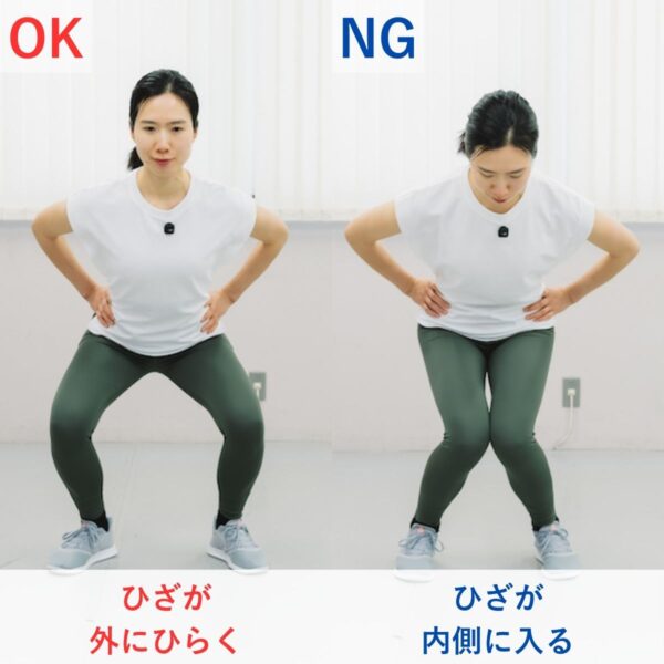 とくに筋力が不足している場合はひざが内側に入りやすいため、つま先とひざの向きをそろえる意識が大切です。