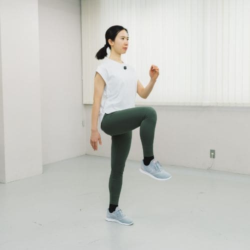 なんとなく足踏みするだけだと動きが小さくなりやすいですが、ひざを腰の高さまで上げるイメージを持つとリズムよく続けやすく感じました。