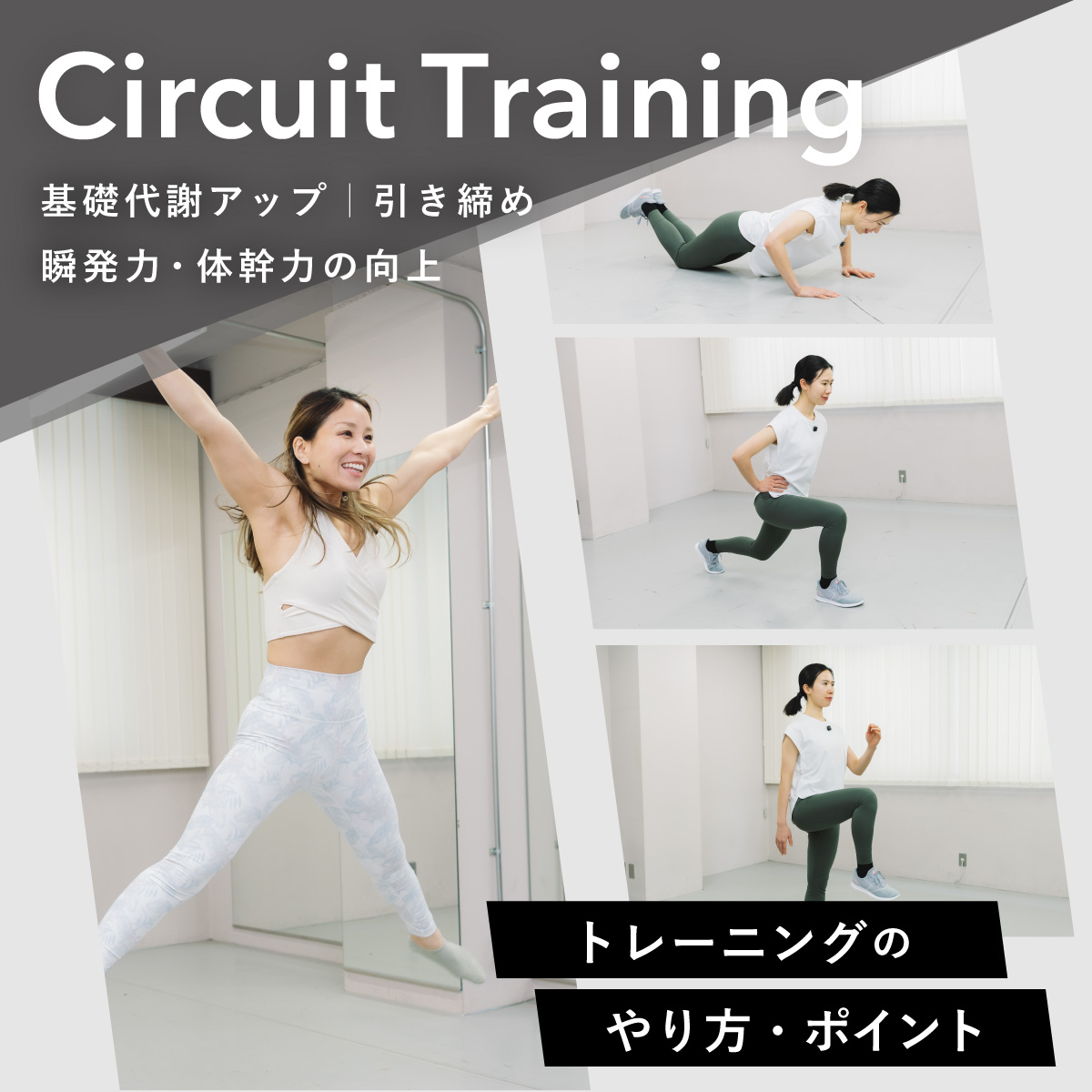サーキットトレーニングは短い休憩を挟みながら、スクワット、プッシュアップなどの複数種目を連続しておこなうトレーニング。有酸素運動と筋トレの要素があり、心拍数を保ちやすい点が特徴。