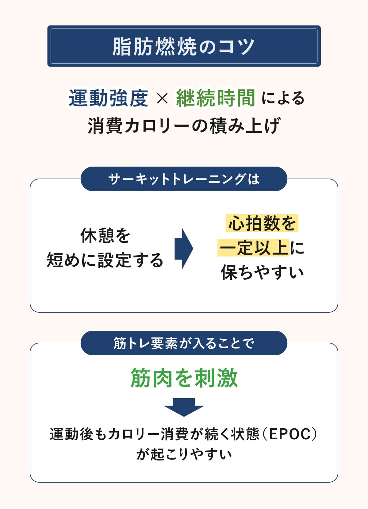 脂肪燃焼の鍵は「運動強度×継続時間」による消費カロリーの積み上げ。サーキットトレーニングは休憩を短く設定しやすく、心拍数を一定以上に保ちやすい点が効果的になりやすい。