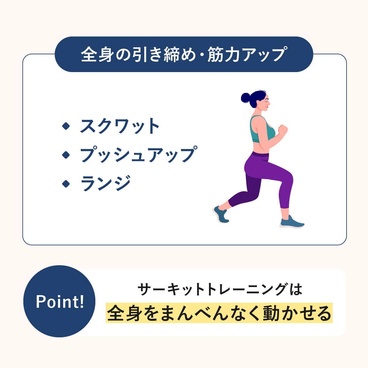 スクワット、プッシュアップ、ランジなど多関節種目を組み込みやすく、サーキットトレーニングでは全身をまんべんなく動かす構成になりやすい。反復で筋肉へ刺激が入り、フォームを崩さない範囲の負荷設定で筋力向上も狙える。