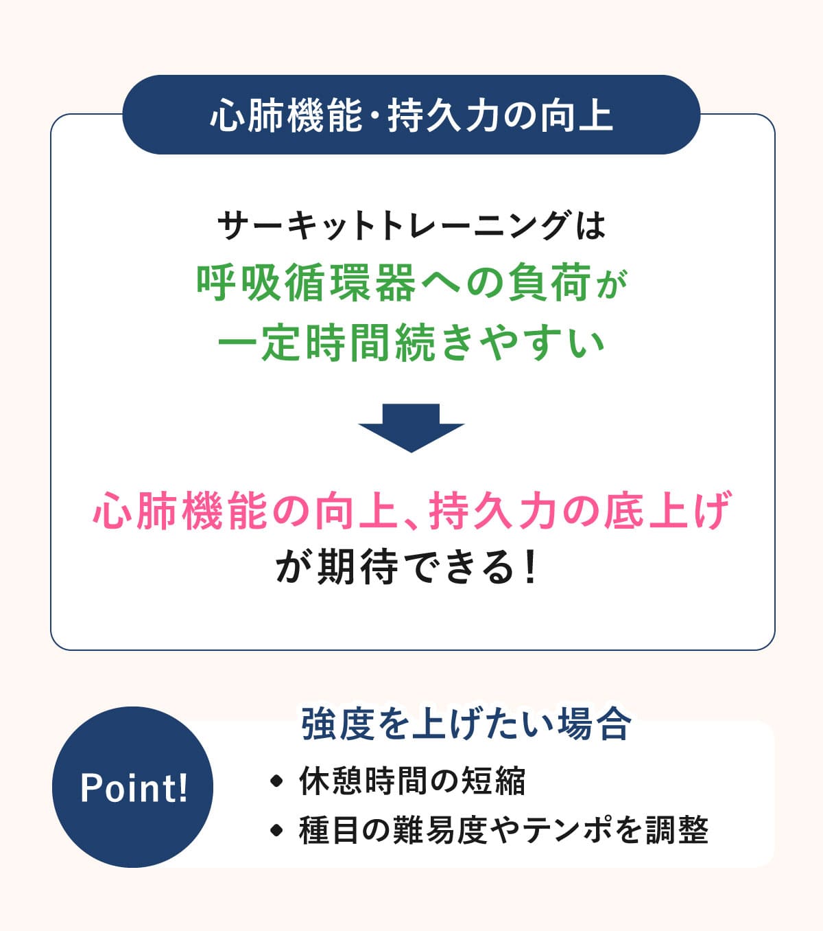 短い休憩で動き続ける設計により、呼吸循環器への負荷が一定時間続きやすい。結果として心肺機能の向上、持久力の底上げが期待される。息が少し上がる程度の強度を目安にするのがおすすめ。