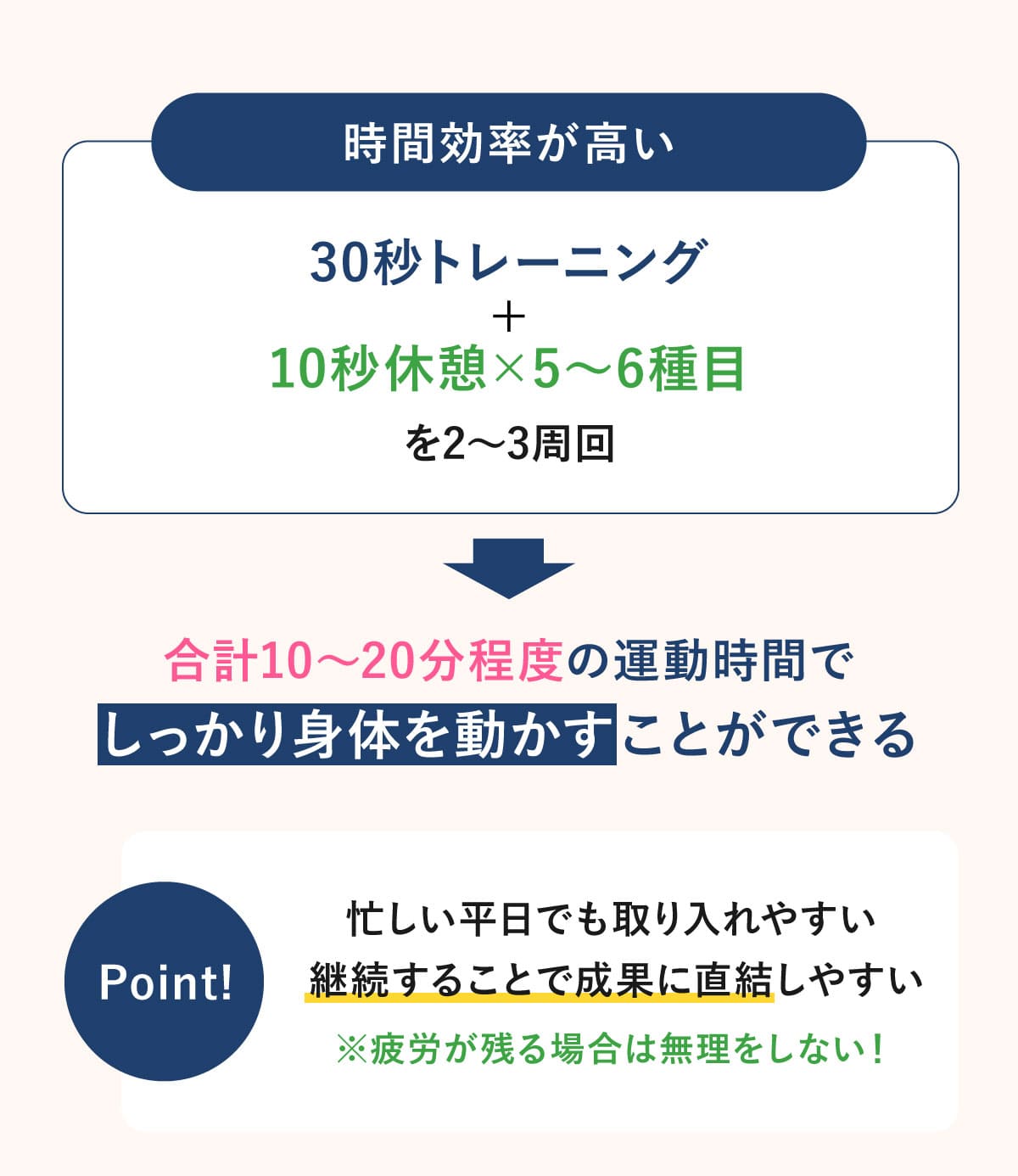 | 短時間で運動したい人 | 種目を連続しておこなうため、短時間でも運動量を確保しやすい |