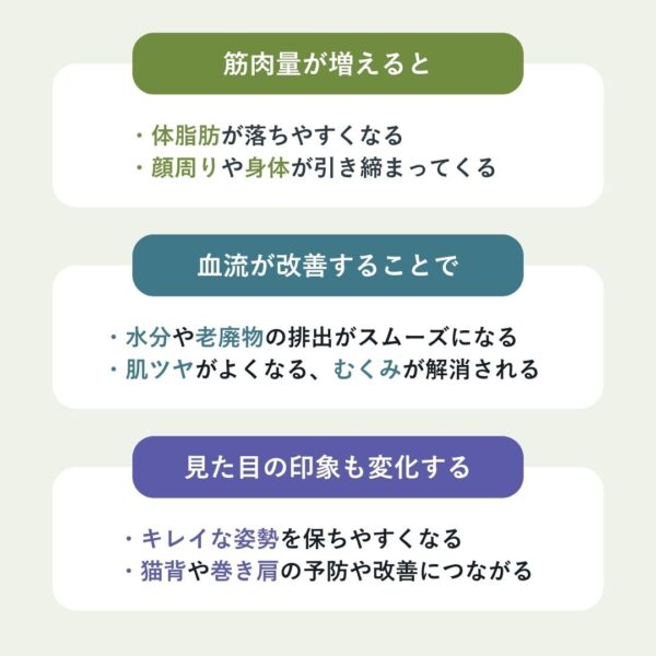 筋肉量が増えることで、全身の体脂肪が落ちやすくなり、顔周りや身体が引き締まってくる。