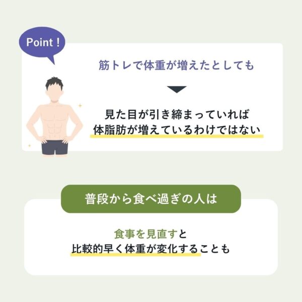 筋トレを続けていくと筋肉量が増えるので、食事量を増やし続けた場合は、それにともない体重が増加することはある。