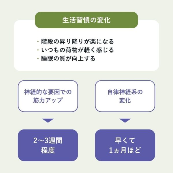 一方、自律神経系の変化はすぐに起こるわけではなく、早くて1ヵ月ほどで徐々に実感できるようになる。