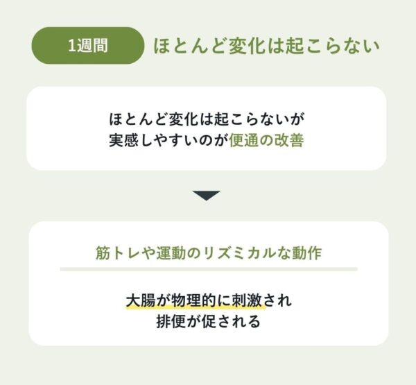 筋トレを始めてから1週間くらいでは、ほとんど変化は起こらないが、比較的実感しやすいのが便通の改善。
