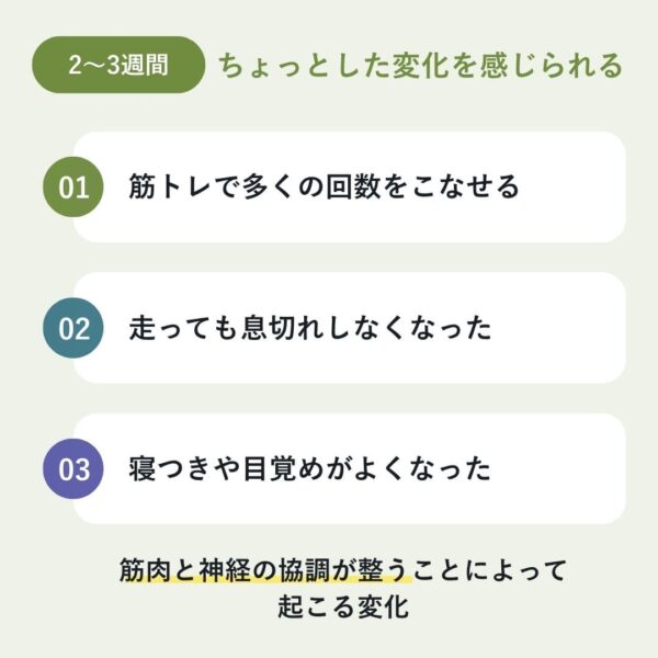 - 2~3週間:ちょっとした変化を感じられるようになる