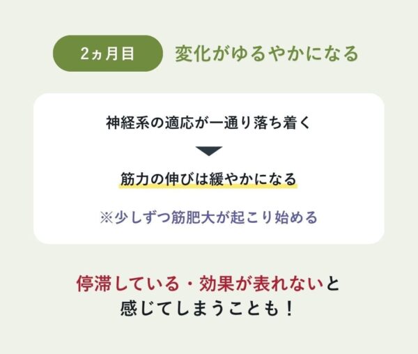 ただし、2ヵ月目は神経系の適応が落ち着いて変化がゆるやかになりやすく、フォームが間違っていると狙った部位にアプローチできないため、長期的な視点で変化を見ることが重要。