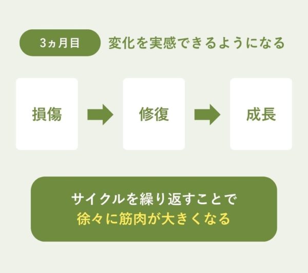 この「損傷→修復→成長」のサイクルを繰り返すことで、徐々に筋肉が大きくなるが、実感できるほどの変化が起こるには、3ヵ月ほどかかる。